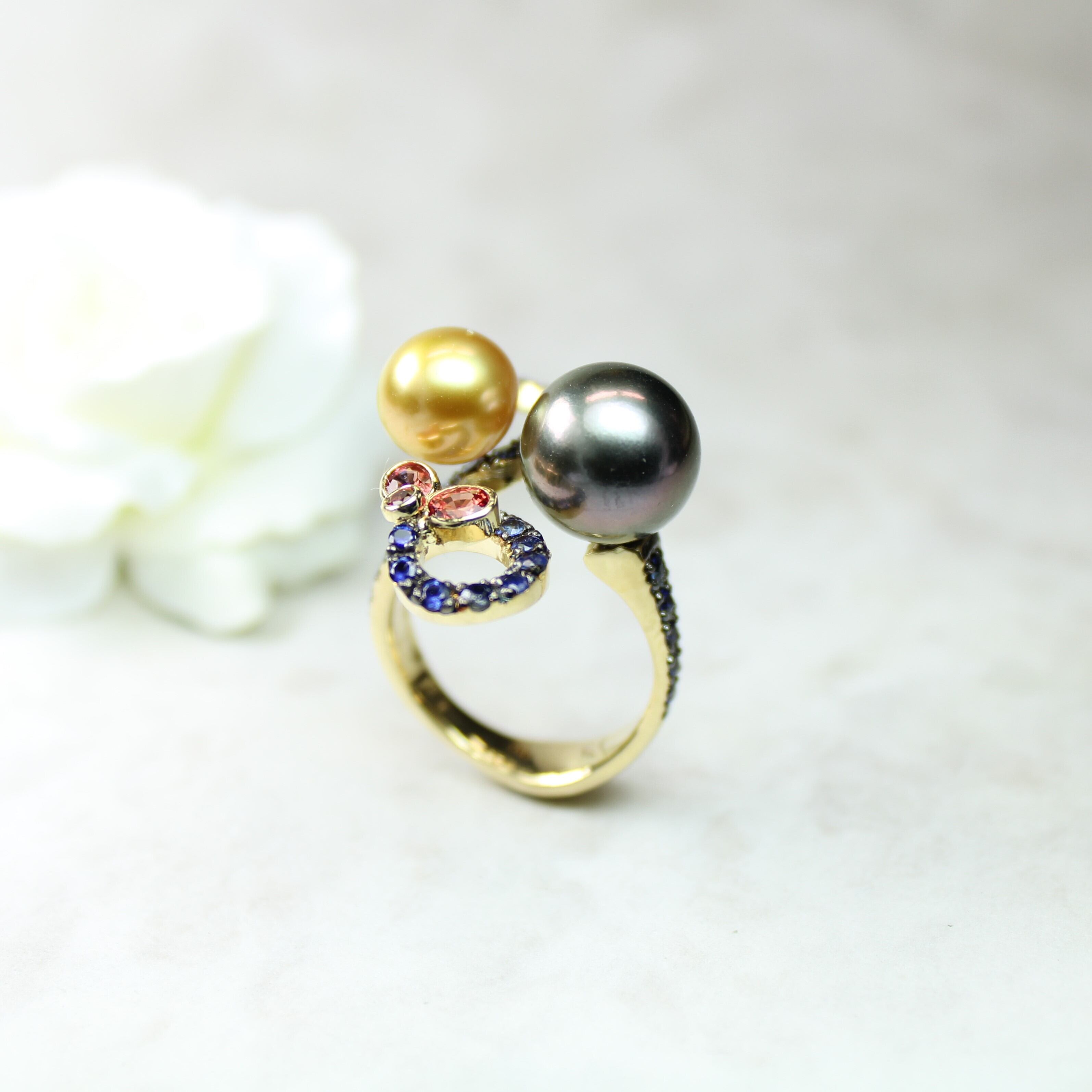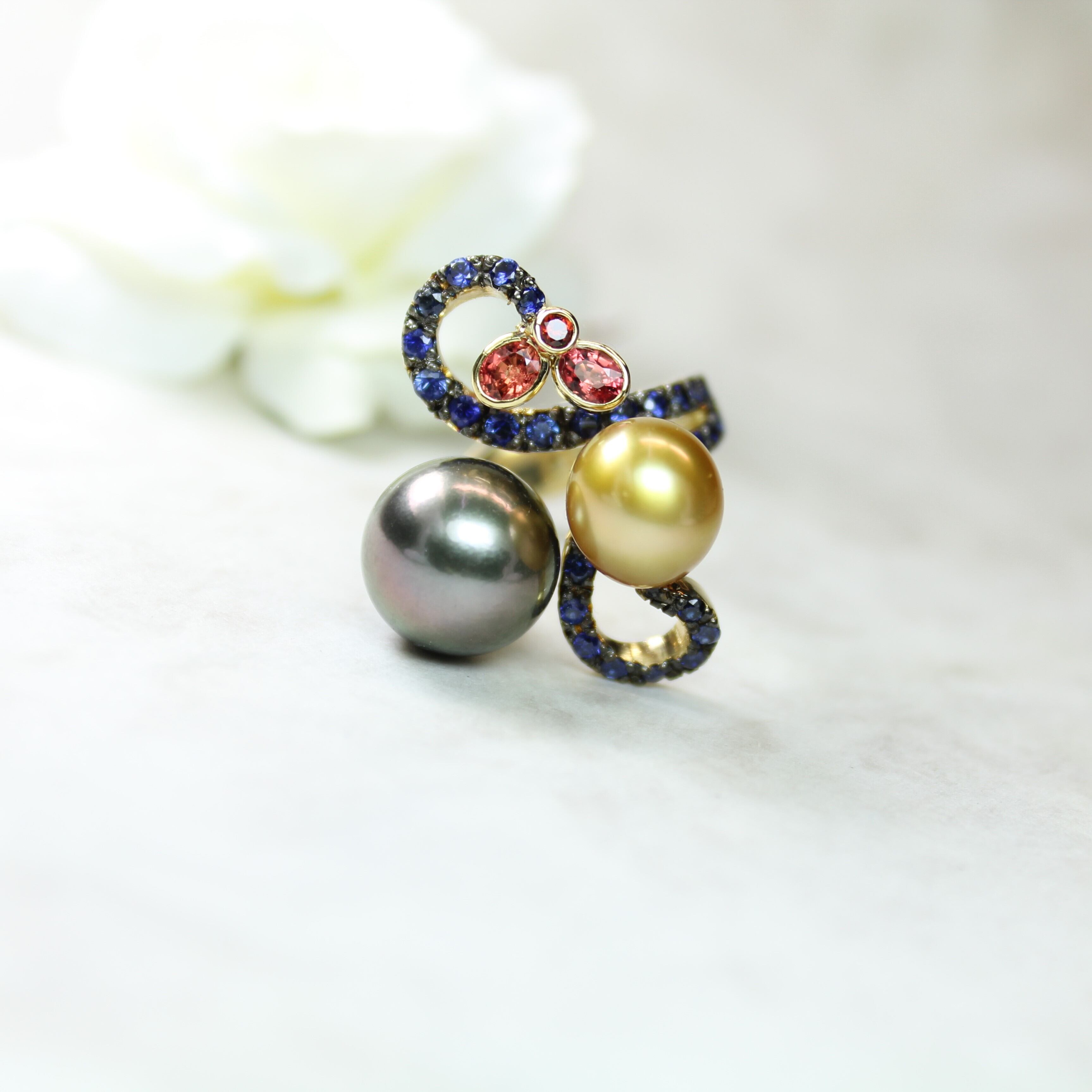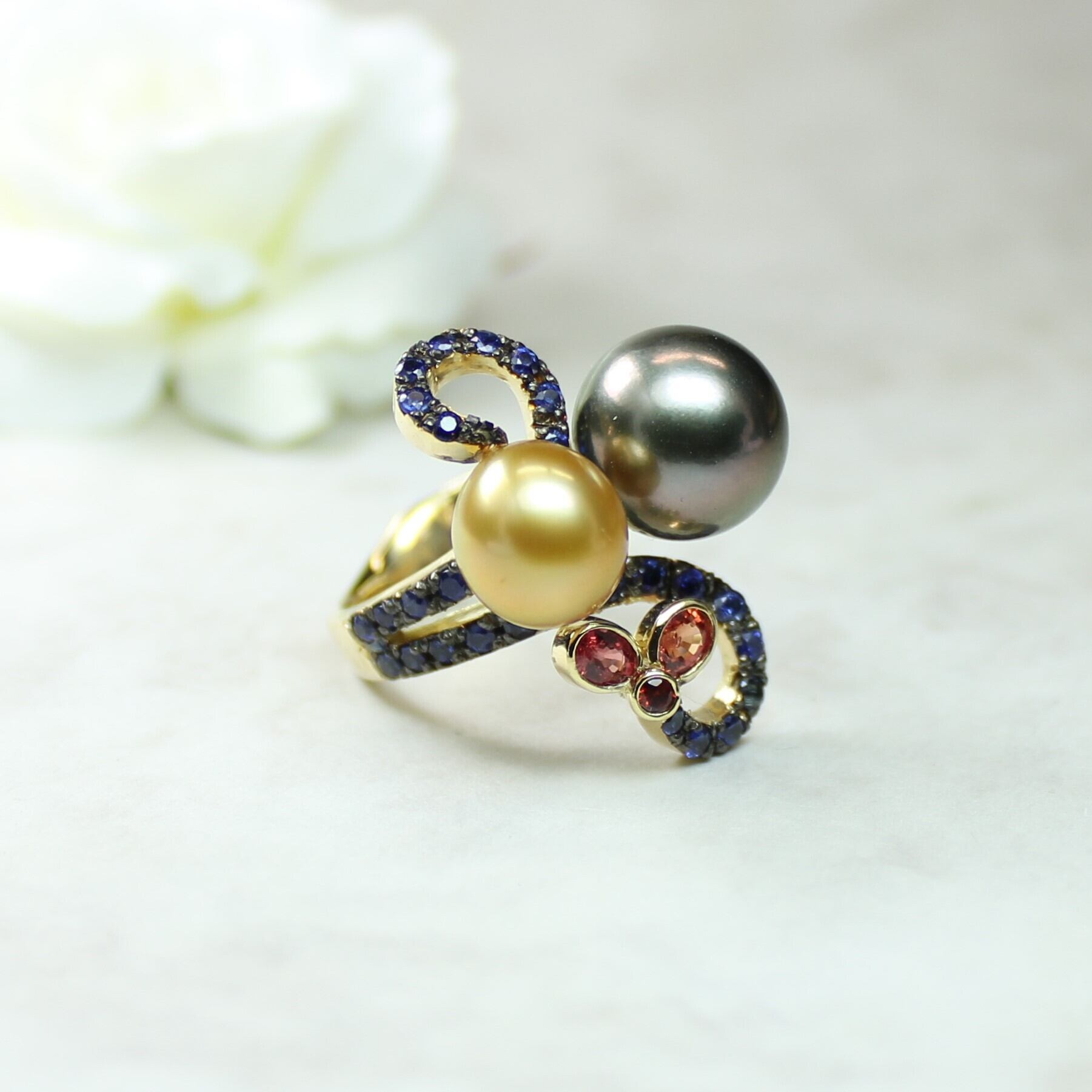 素材:K18、南洋真珠(ブラック、ゴールド)ルビー、サファイア