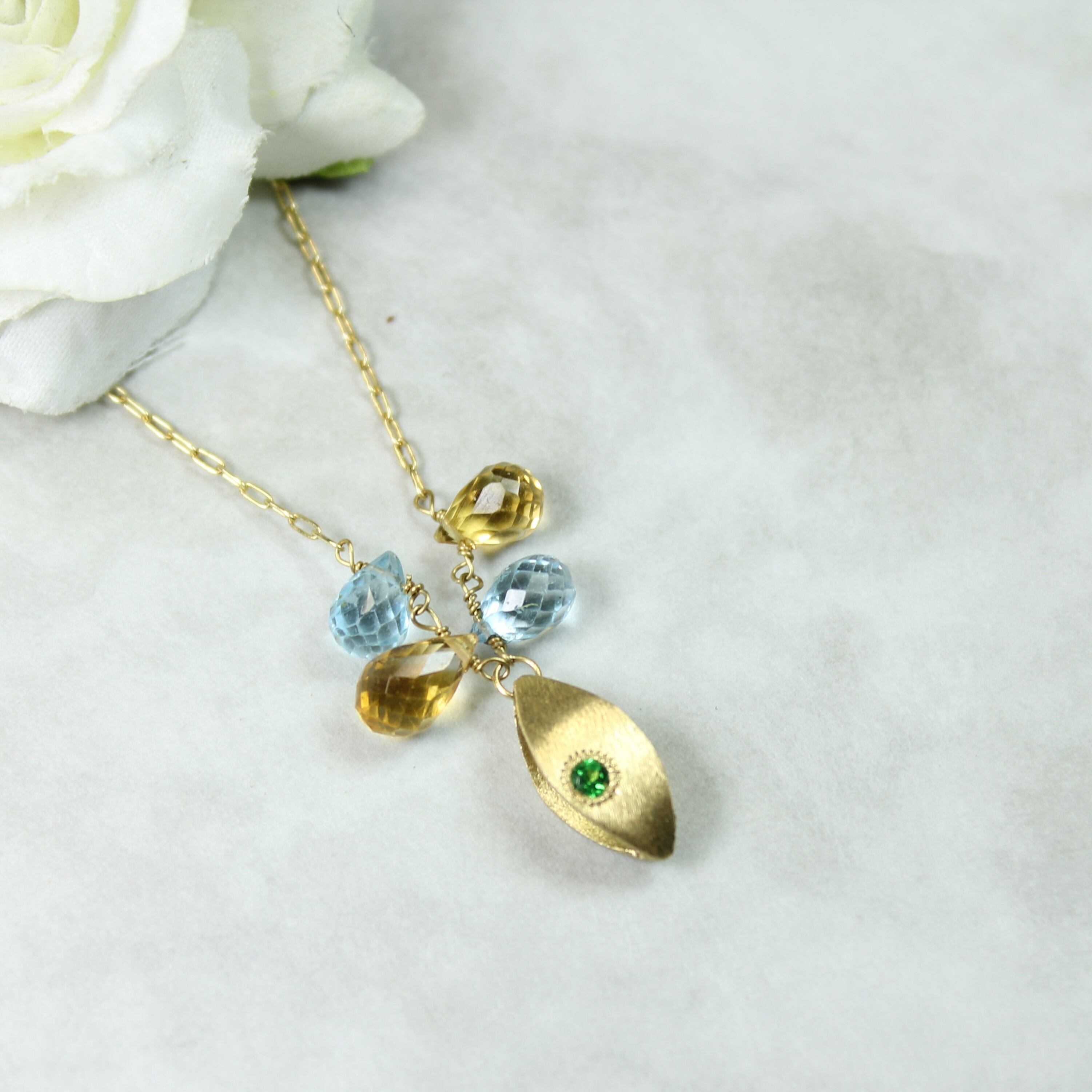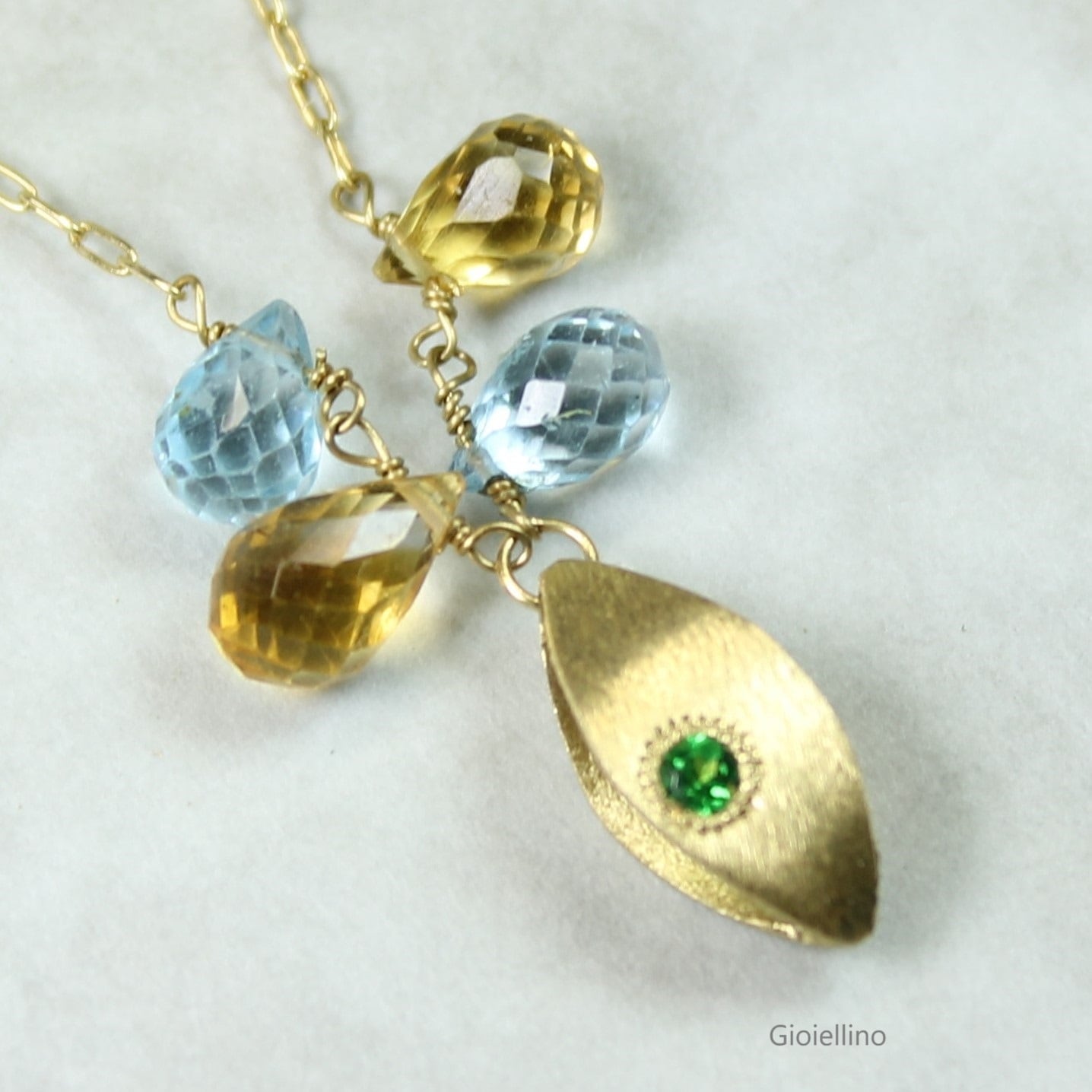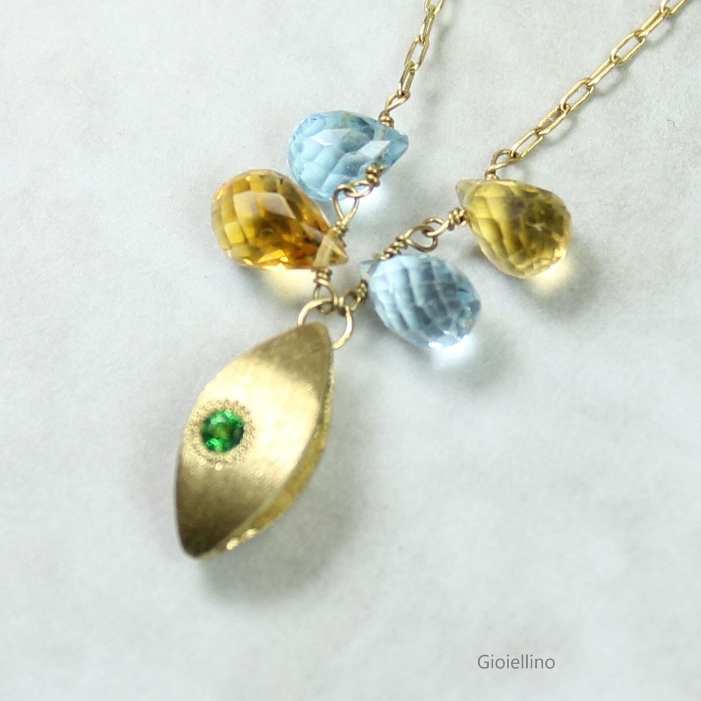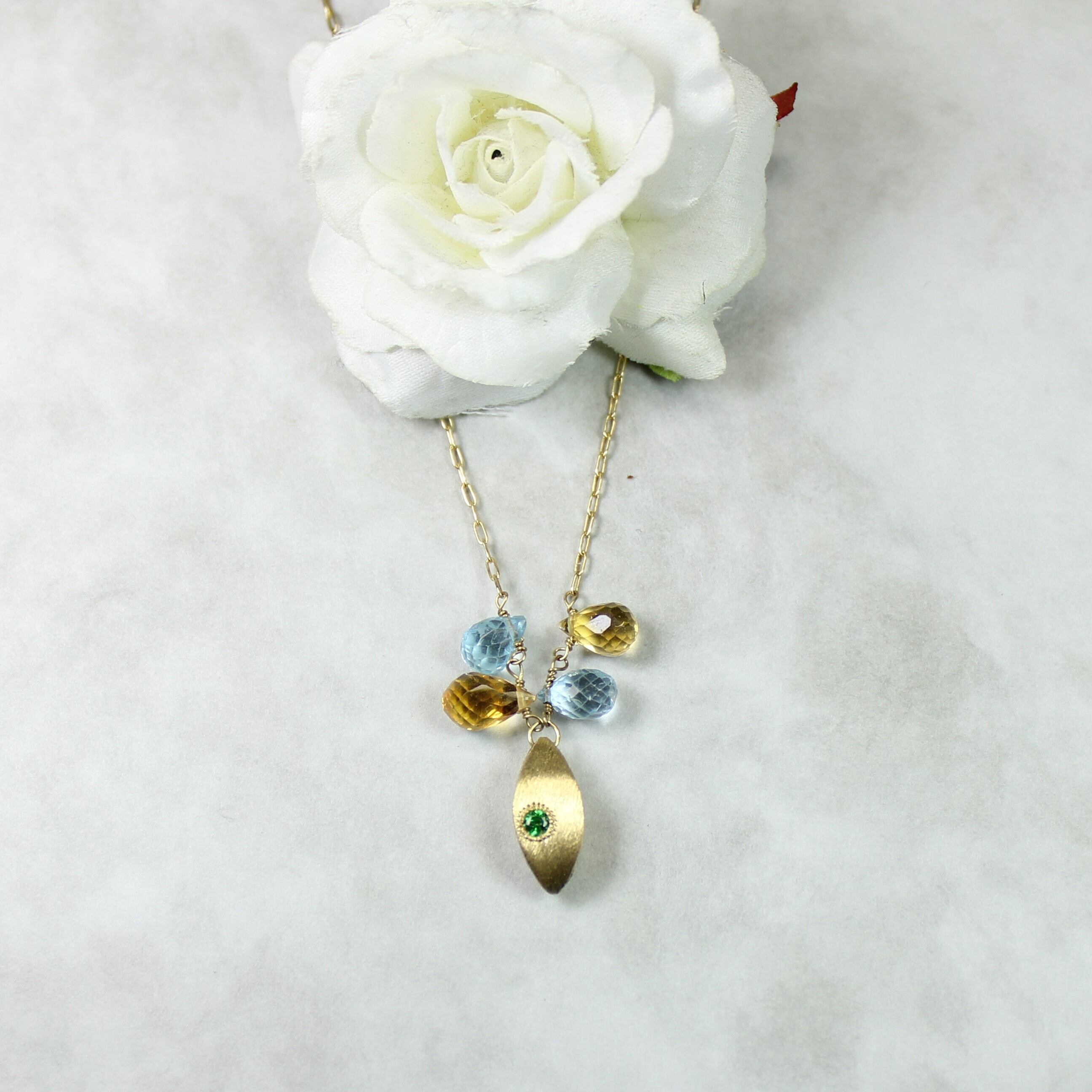 K18を基調とした土台にグリーンガーネットを埋め込みました。ブルートパーズとシトリントパーズが揺れるキュートなネックレスです。チェーンは一体型になっており、取り外しは出来ません。