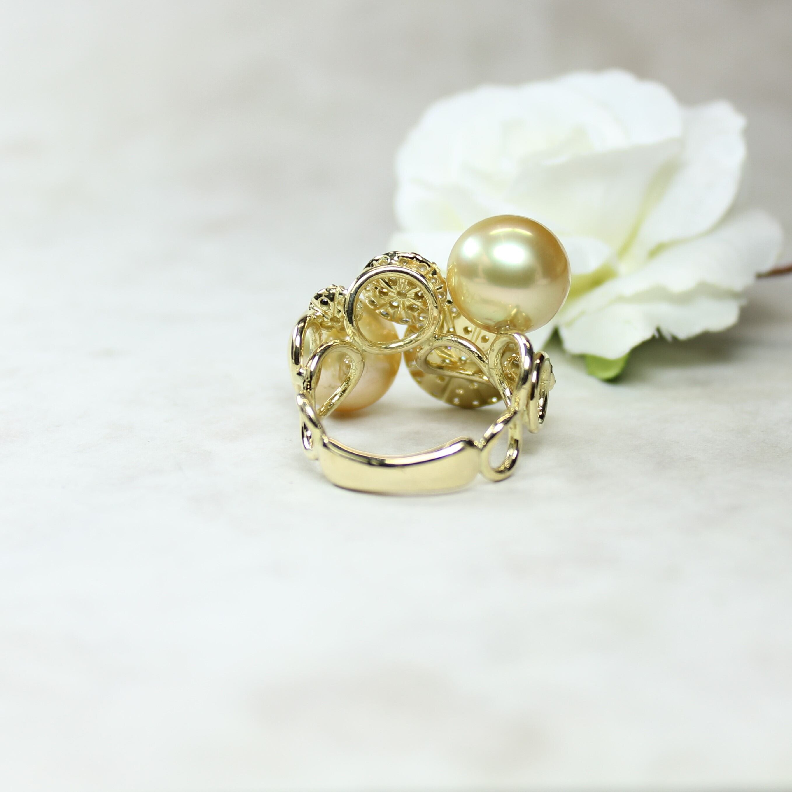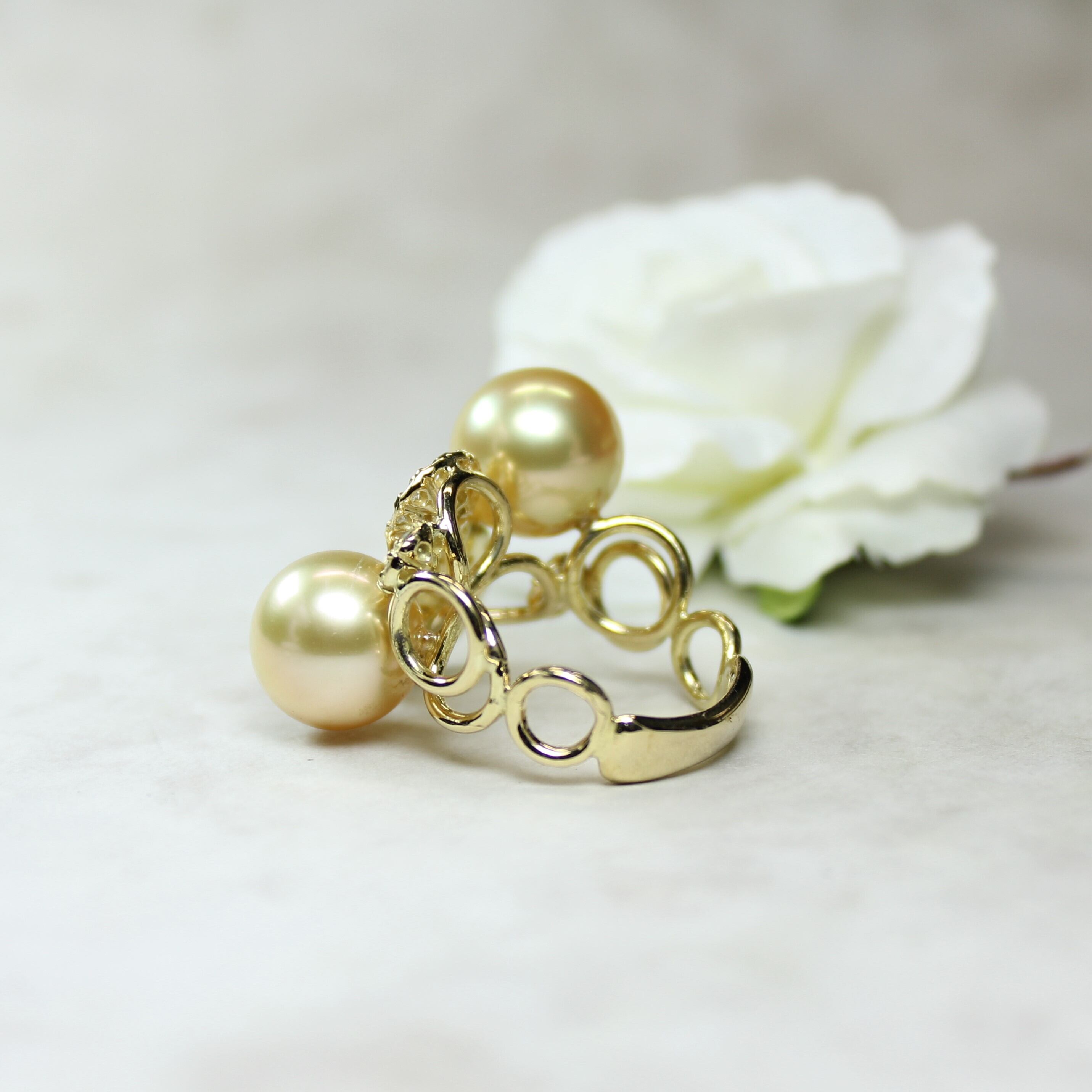 リングの中央に輝く南洋真珠は、その美しいツヤと豊かな色合いが特徴。パヴェダイヤモンドが上品に留められ、リング全体を華やかに飾ります。洗練されたデザインはオンにもオフにもマッチするため、幅広いシーンでご利用いただけます。