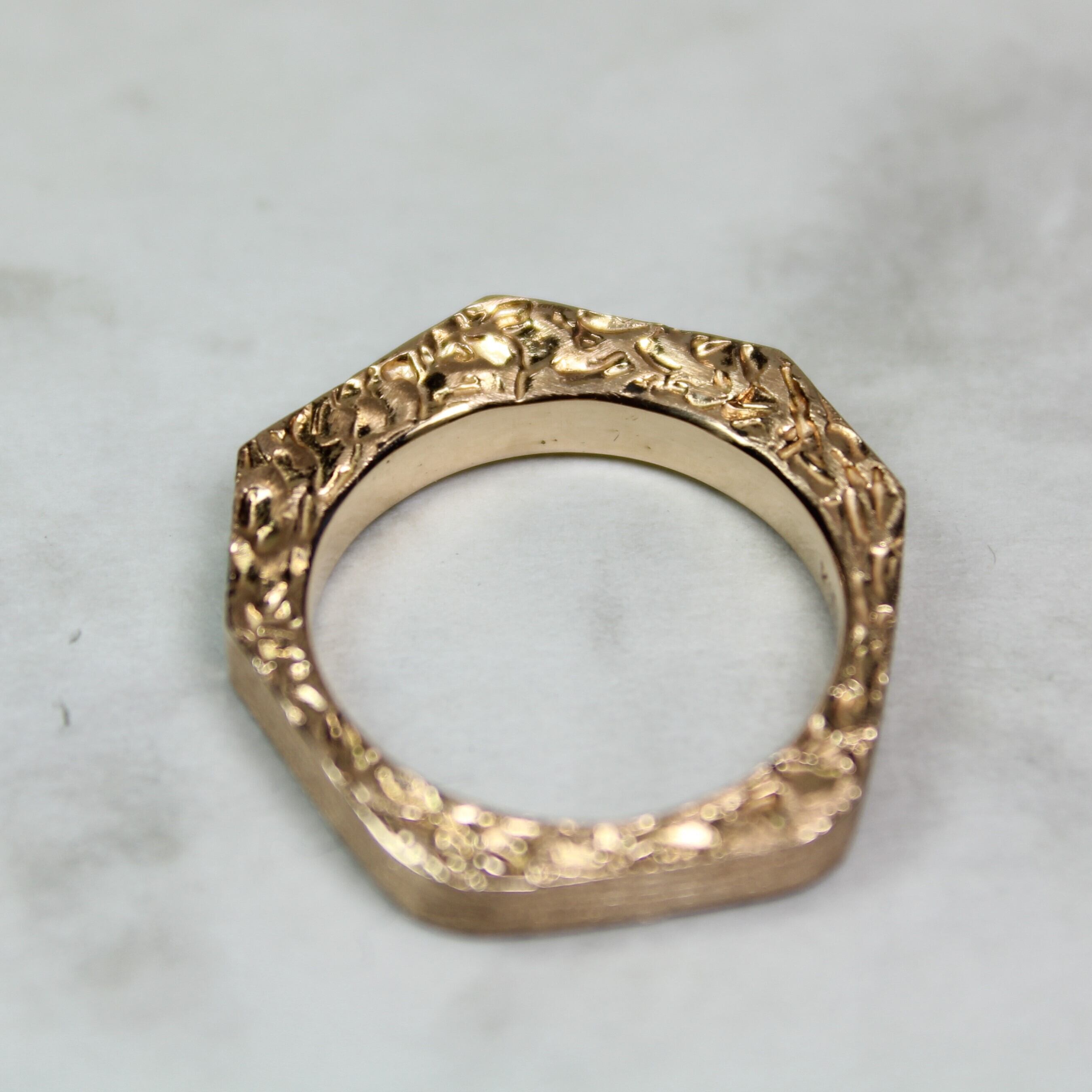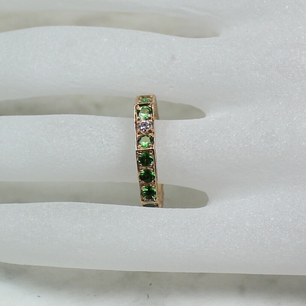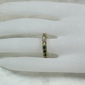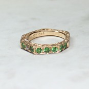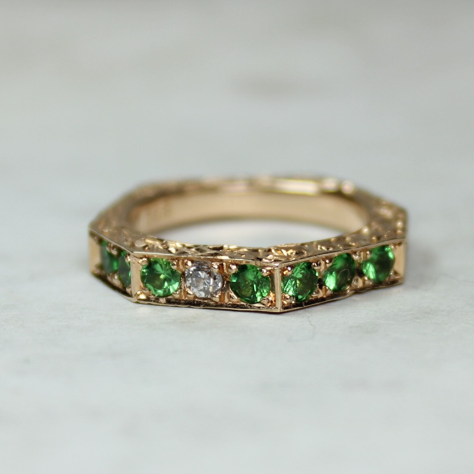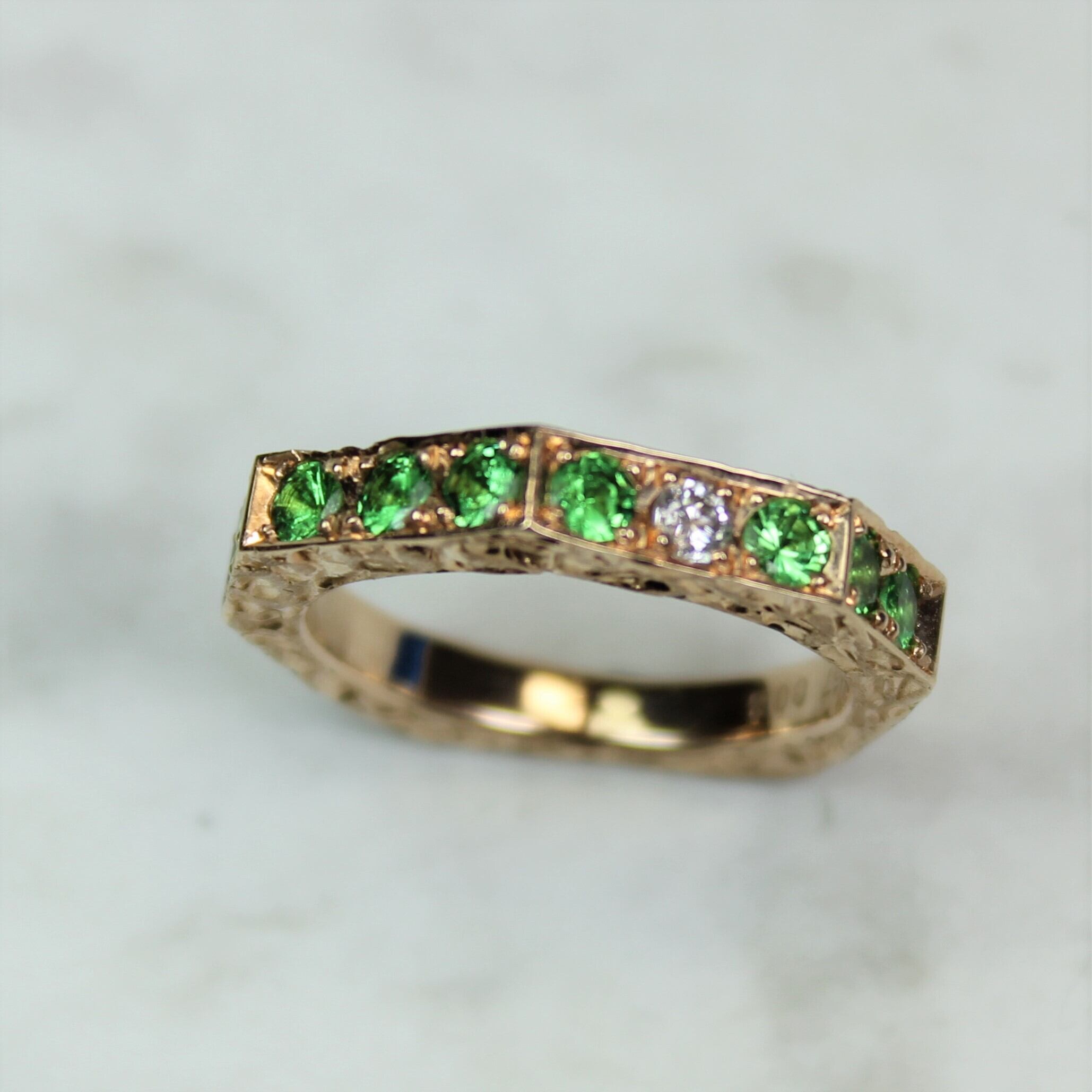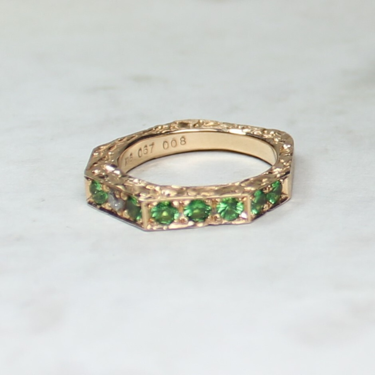 K18(ピンクゴールド)にグリーンガーネット7粒と一粒ダイヤモンドを埋め込んだリングです。リングサイドに模様を入れたデザインリングです。