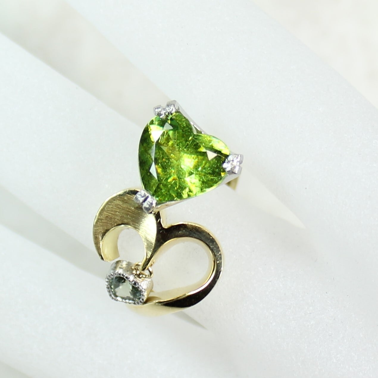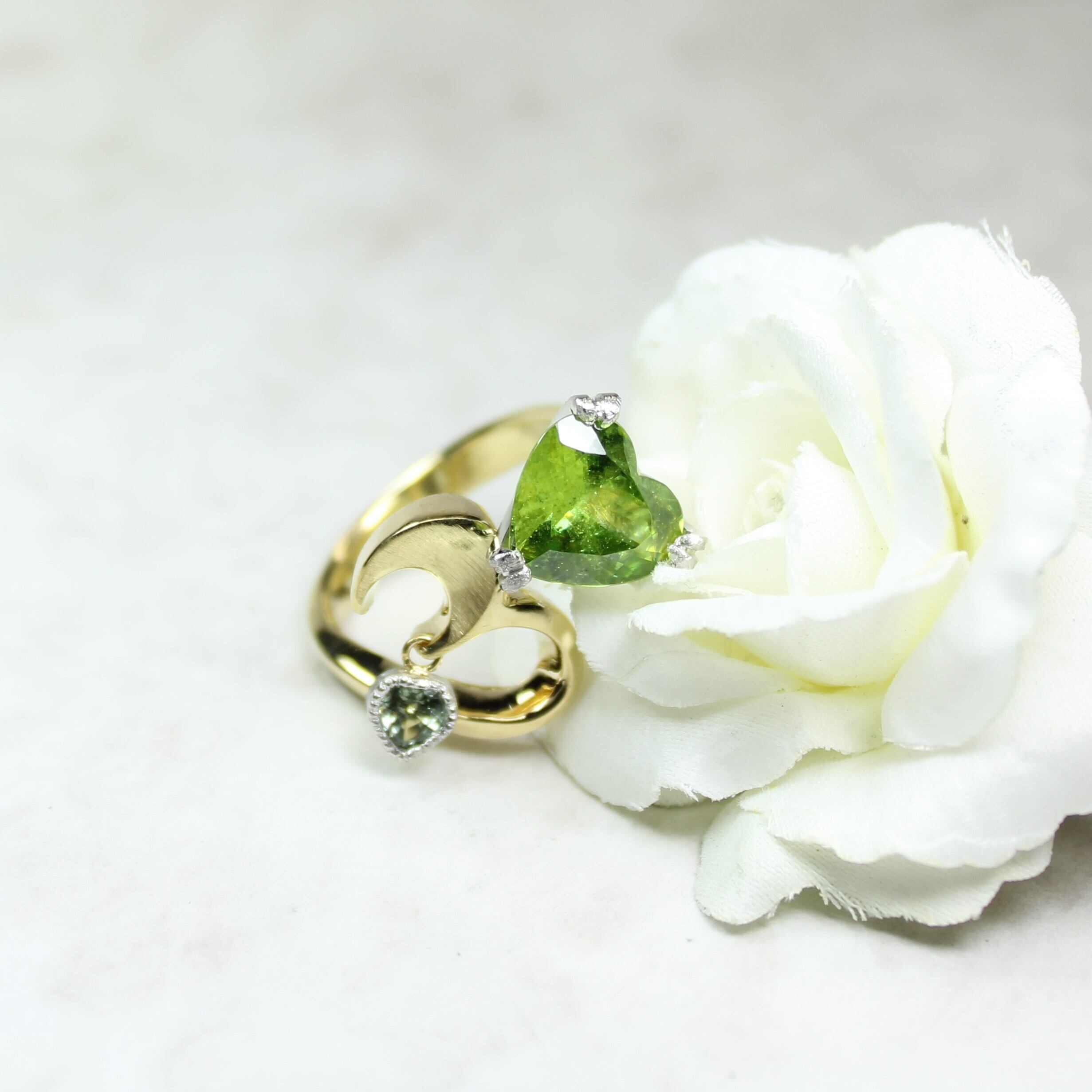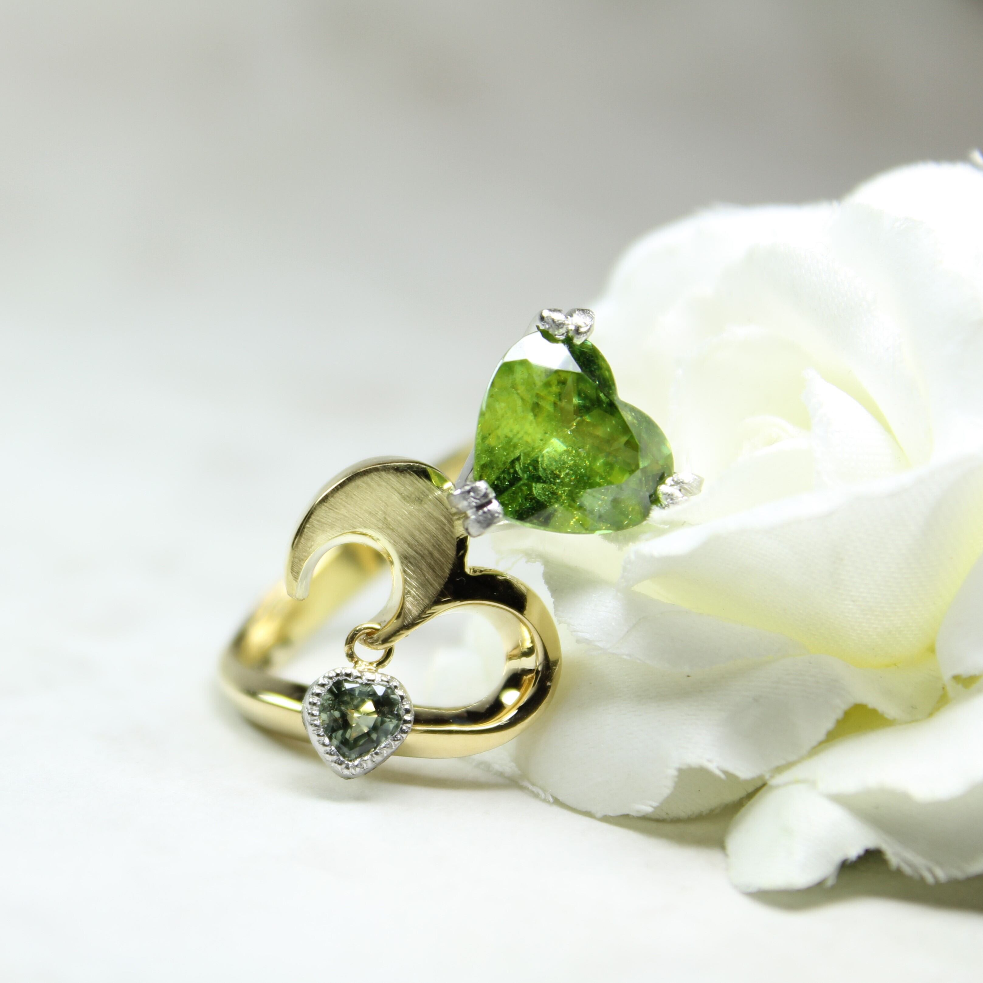 K18リングにスフェーンを合わせています。スフェーンの石留部分にプラチナを使用、サファイアが揺れる豪華なリングです。