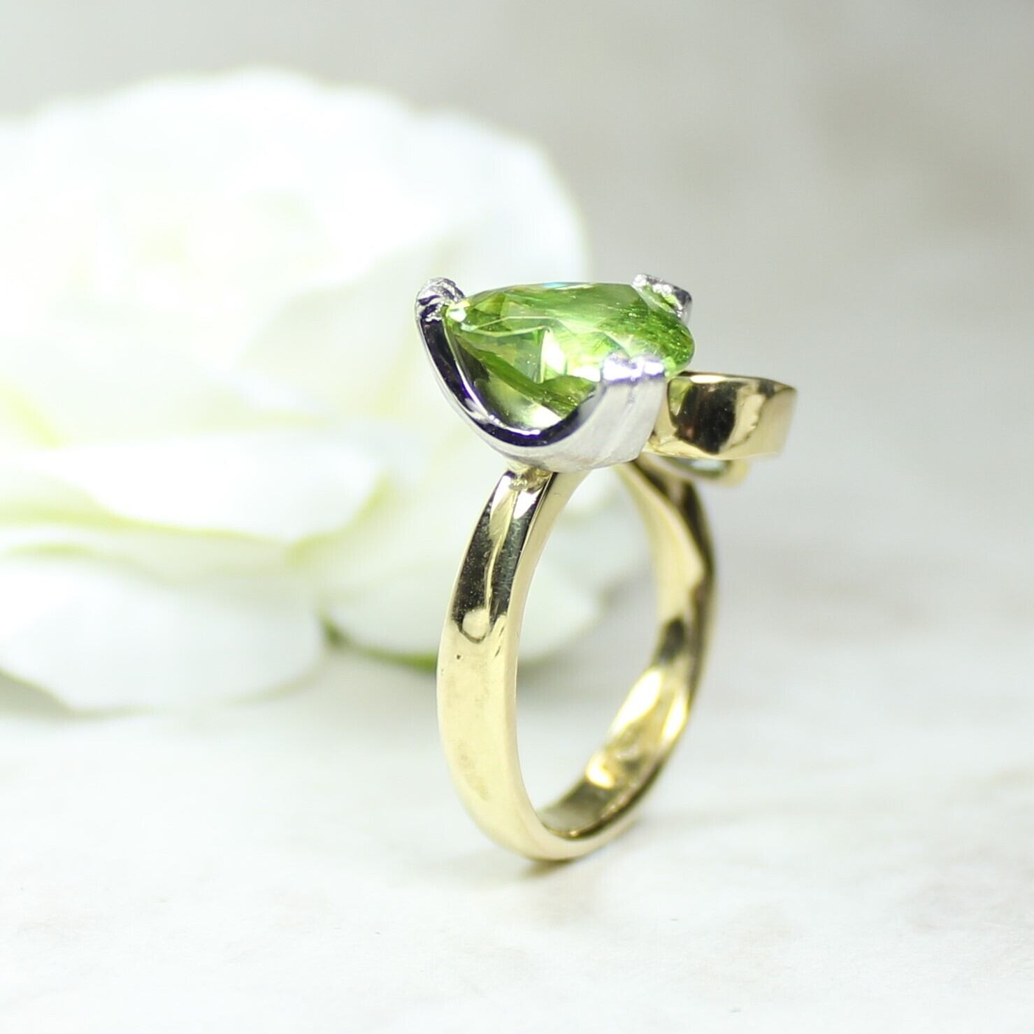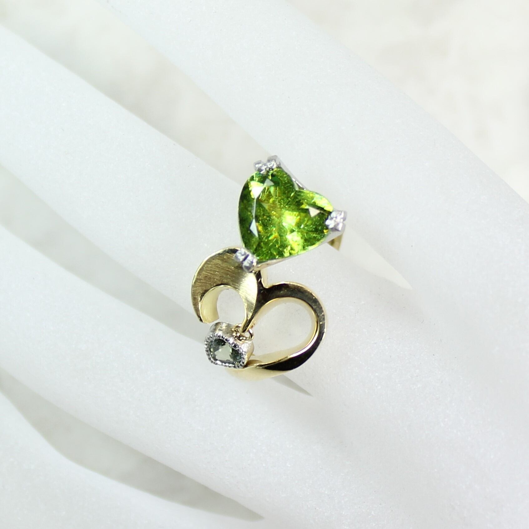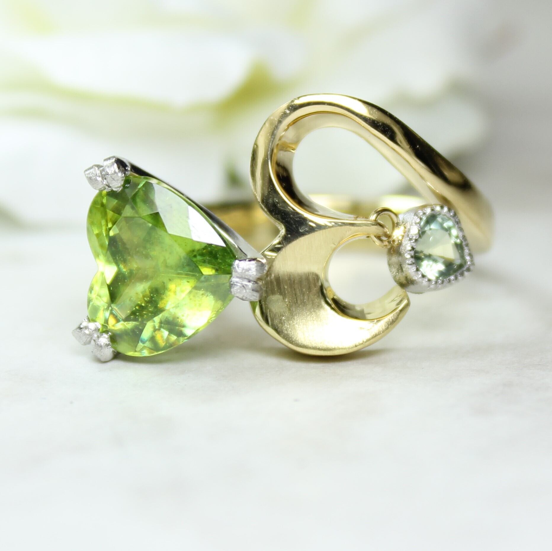 K18リングにスフェーンを合わせています。スフェーンの石留部分にプラチナを使用、サファイアが揺れる豪華なリングです。